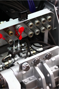Auch die Hydraulikanlage kann sich sehen lassen. Zwei Pumpen mit einer Förderleistung von 180l/min stehen für die Versorgung der internen und externen Aggregate zur Verfügung. Der Kraftheber hinten ist mit einem EHR- System ausgestattet und es können 4 doppelwirkende Steuerventile angeschlossen werden. Der Frontbereich ist mit einem EHR- System und 2 doppelwirkenden Steuerventile vorbereitet. Der Frontkraftheber ist noch nicht installiert.