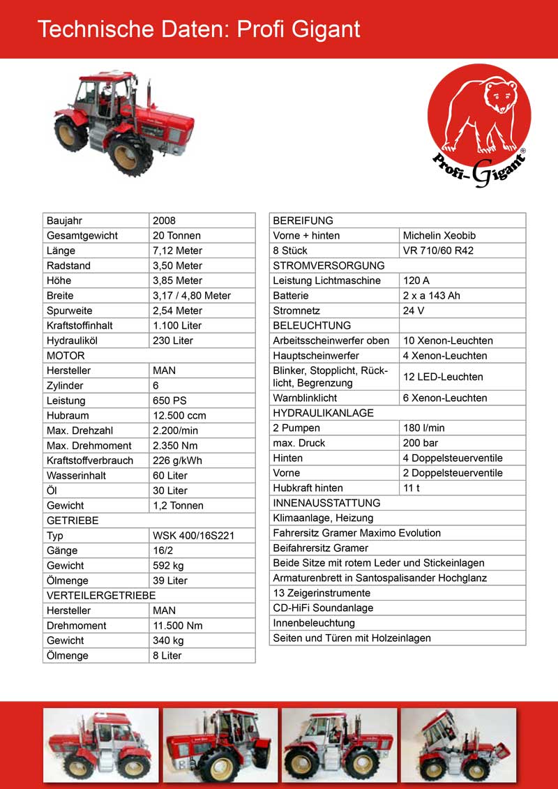 Im Jahre 2008 wurde der Profi Gigant das erste Mal der Öffentlichkeit präsentiert. Von der Motorhaube bis zu den Enden der Unterlenker misst der Profi Gigant 7,12 m.